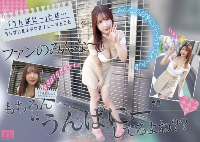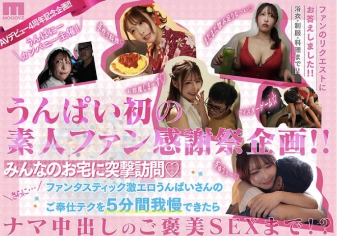 在新作品中,「Unpai」也推出4周年纪念作,名为「うんぱにーカンパニー主催!AVデビュー4周年记念!! ファンの自宅に突撃访问ご奉仕エロテクに我慢デキたらナマ内--入しSEX素人ファン感谢祭」这是一天限定的企划,来感谢素人粉丝们一直以来的支持。申请的粉丝将会惊喜地发现「Unpai」上门服务,如果他们能忍受「Unpai」五分钟的挑逗服务,就能获得无套内--入奖励!