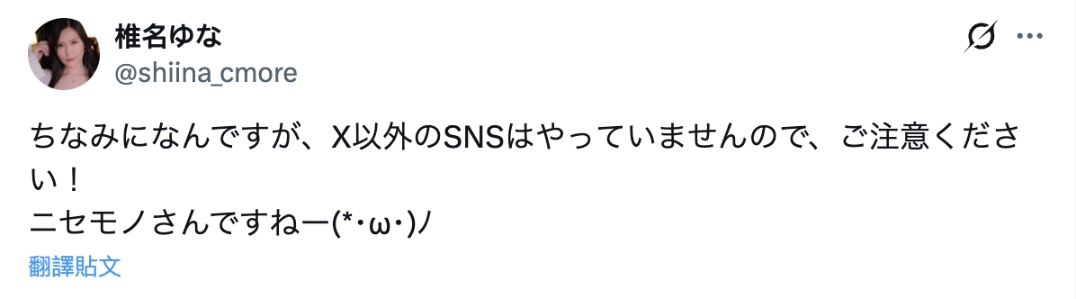 不管你喜欢哪一个,重点是社群上有很多伪装是女优本人的帐号,之前来过台湾举办摄影会的资深女优「椎名ゆな(椎名由奈)」就在X( https://x.com/shiina_cmore )澄清,自己从来没有用过IG,换言之,那个已经累积4万粉丝的IG帐号是假的!