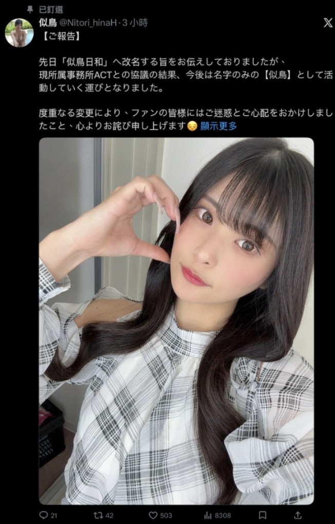 不久前才宣布更换经纪公司、成为ACT Entertainment一员并且改名的「似鸟日和(原似鸟日菜)」刚刚又在社群发文,所以经纪公司讨论过后决定再修改艺名,从今天开始,她只保留姓氏去掉名字,新艺名为「似鸟」: