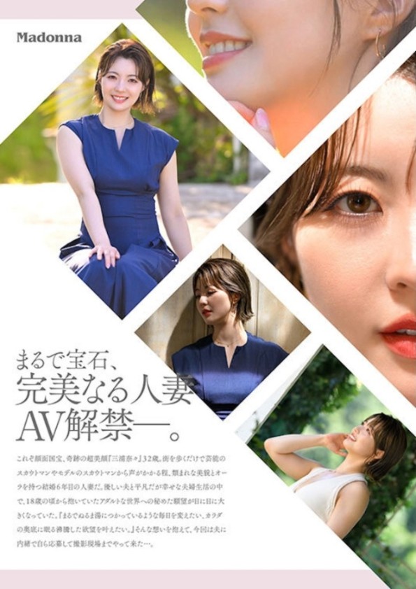 片商Madonna在这个月推出了一位短发的钻石级新人,她叫做「三浦奈々」,今年约32岁,属于知X成熟的类型,曲线凹凸有致,片商形容她有着超过80分的颜值,如同钻石般闪耀,走在路上都会引起星探的注意,是新生代面孔的代表。