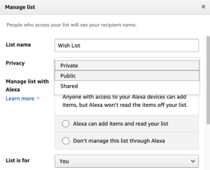 愿望清单类似于礼品登记。任何拥有亚马逊账户的人都可以创建一个愿望清单并向其中添加项目。根据设置,用户可以选择将列表保密并发送给几个朋友或家人作为礼物,或者用户可以将其设为公开,任何人都可以搜索和购买。