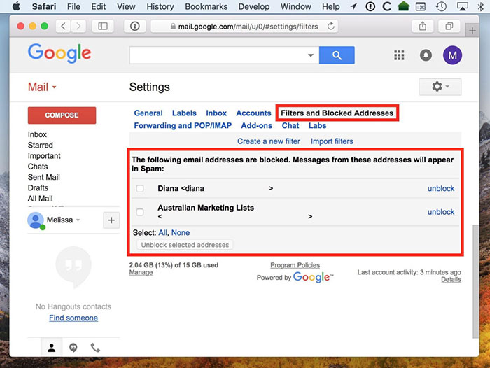 如你所见,每个地址旁边都有一个蓝色的“unblock” ”按钮,但您也可以在要删除的每个地址左侧的框中打勾,然后单击“取消阻止所选地址”选项。 但是,无论哪种方式,您取消阻止的发件人都会从他们的虚拟监狱中获得缓刑,并且他们的消息将开始出现在您的收件箱中。 让我们希望他们开始表现自己!