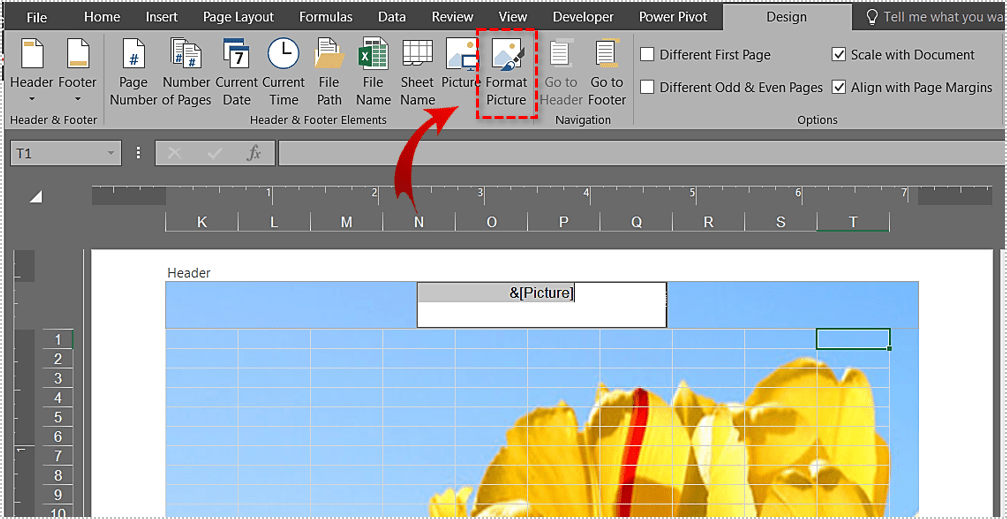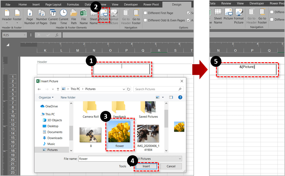 点击标题并选择图片。选择您要使用的图片,然后单击“插入”将其添加到您的项目中。在标题中,您还会看到“&[图片]”文本,它通知您标题现在包含一张图片。