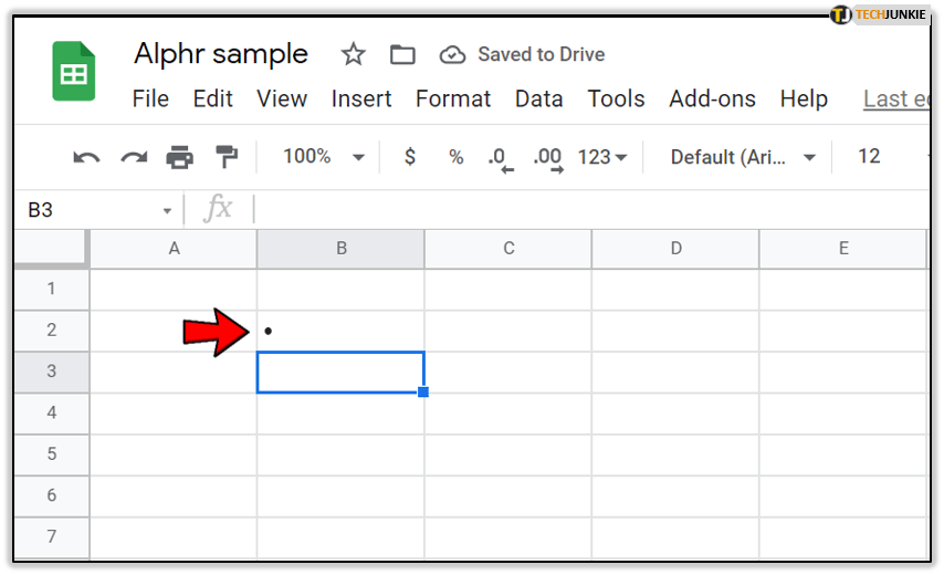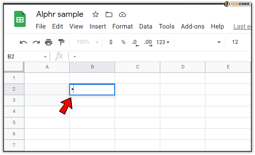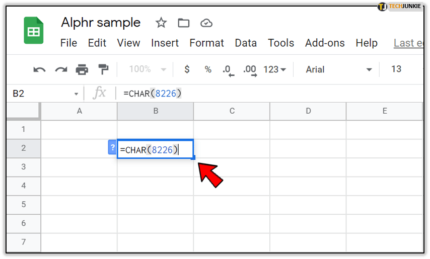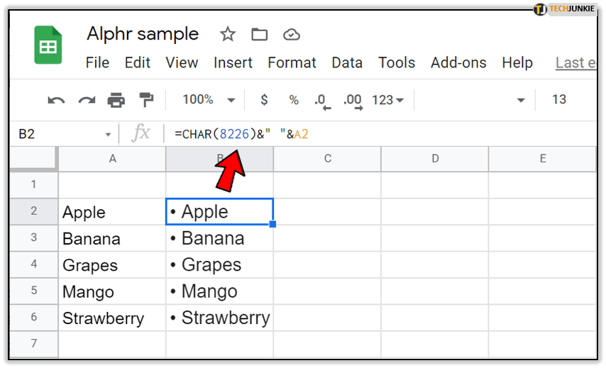 您会看到项目符号立即出现在您的 Google 表格单元格中。此外,您可以使用公式将项目符号自动添加到您已有的列表中。例如,如果您的列表从单元格 A2 开始,要在单元格 B2 中制作项目符号列表,您必须输入: