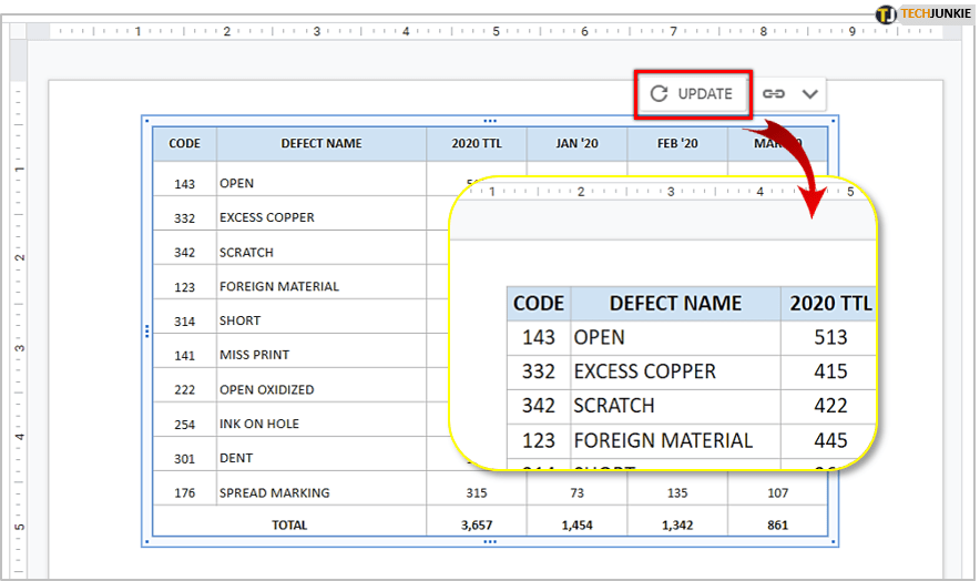 然后,返回到 Google 幻灯片。您应该立即看到您在 Google 表格中所做的所有更改。如果更改没有自动发生,请点击“更新”按钮,您很快就能在此处看到新的格式。