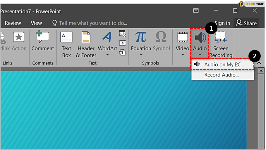 如果您单击扬声器图标下方的小箭头,PowerPoint 将为您提供多种类型的导入。选择您想要的并单击它。选项是“我的电脑上的音频”和“录制音频”。