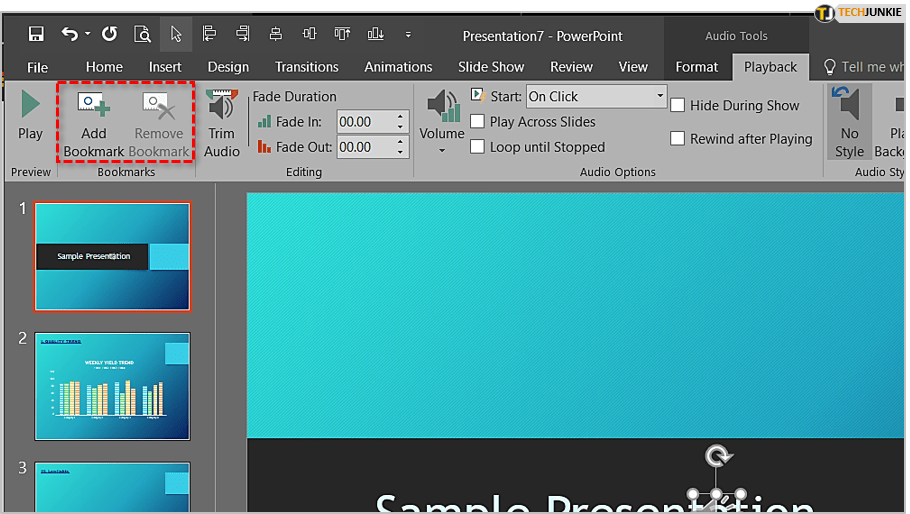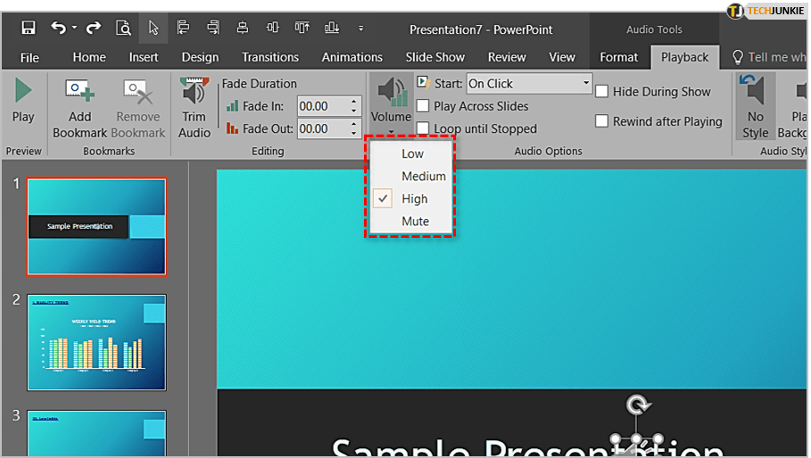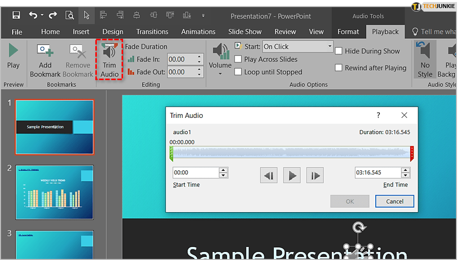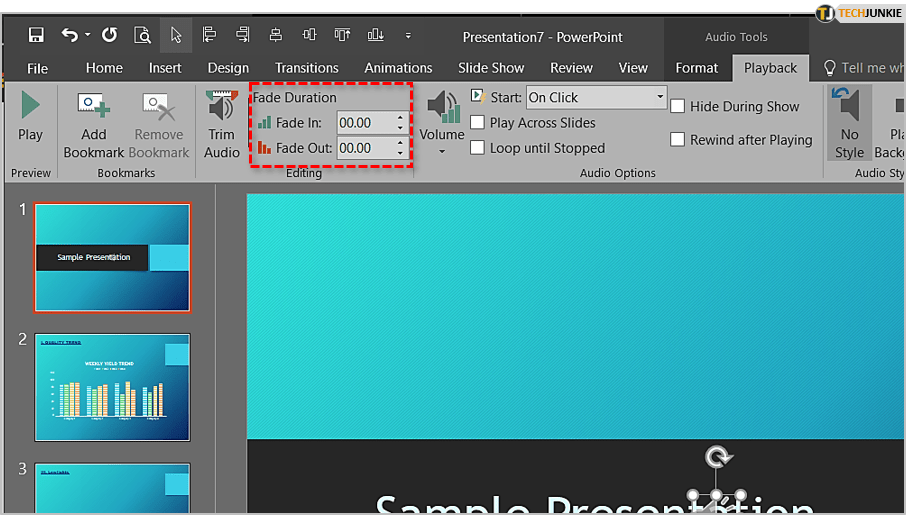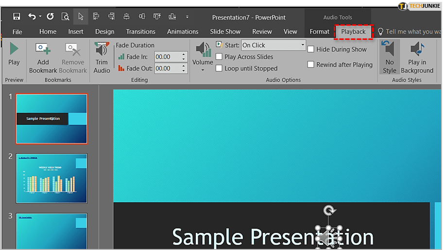 PowerPoint 允许一些基本的文件操作。您可以修剪曲目、设置书签、调整音量、淡入/淡出、循环和倒带。要访问“播放”菜单,请单击您的音频文件,然后单击主菜单中的“播放”选项卡。