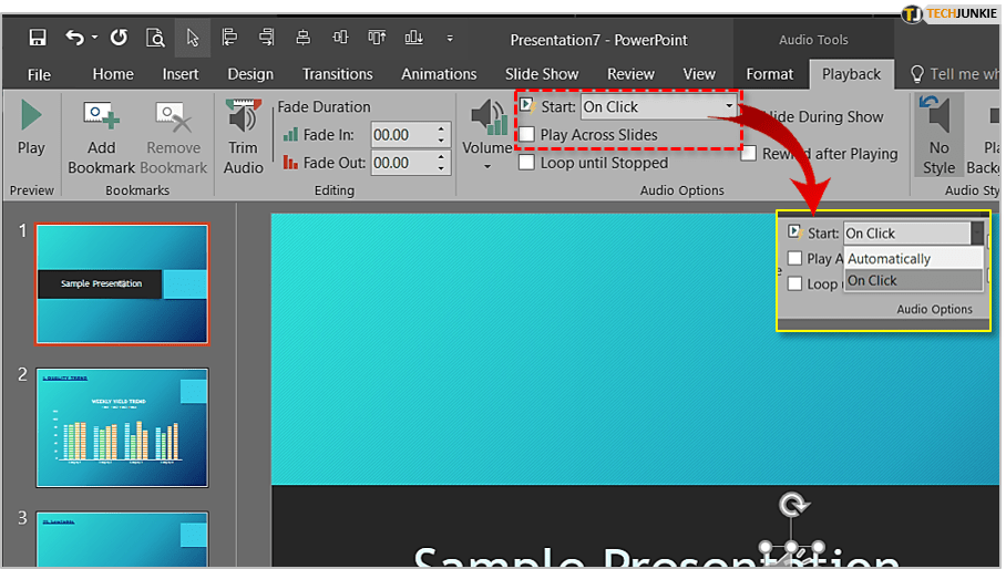 “开始”选项可让您选择文件的启动方式。 “On Click”需要您手动启动,而“Automatically”在激活幻灯片时启动歌曲。 “跨幻灯片播放”播放文件直到演示结束。
