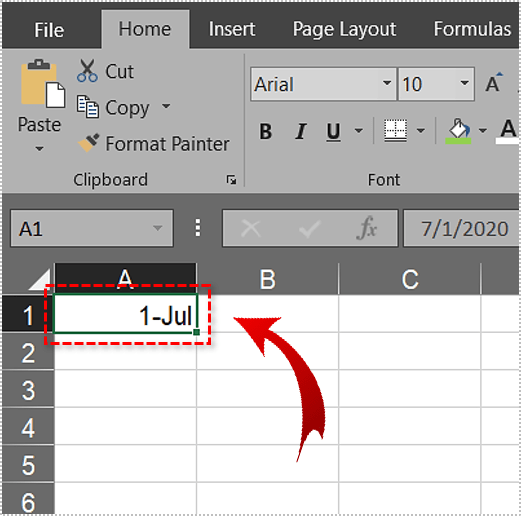 正确输入日期后,Excel 将以默认格式之一显示它。如果您已将月、日和年输入为数字(7-1-19 或 07-01-2019),Excel 会将日期显示为“7/1/2019”。在所有其他情况下,如上一节中所列,日期将在您的工作表中显示为“1-jul”。