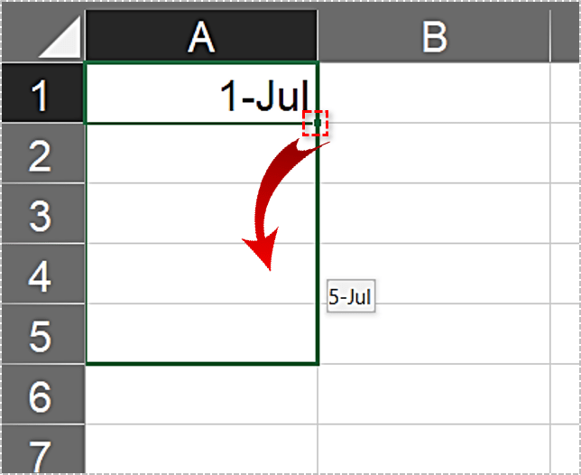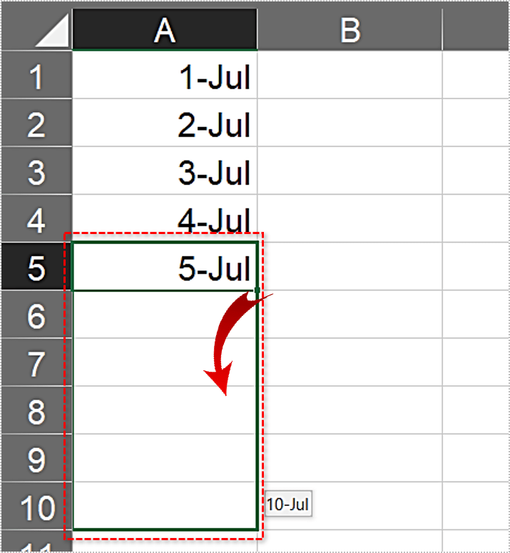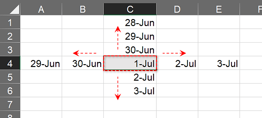 此外,自动填充适用于所有四个方向。如果向右拖动,该行将填充日期。如果向下拖动,该列将被填满。如果向上或向左拖动,日期将开始向后移动。