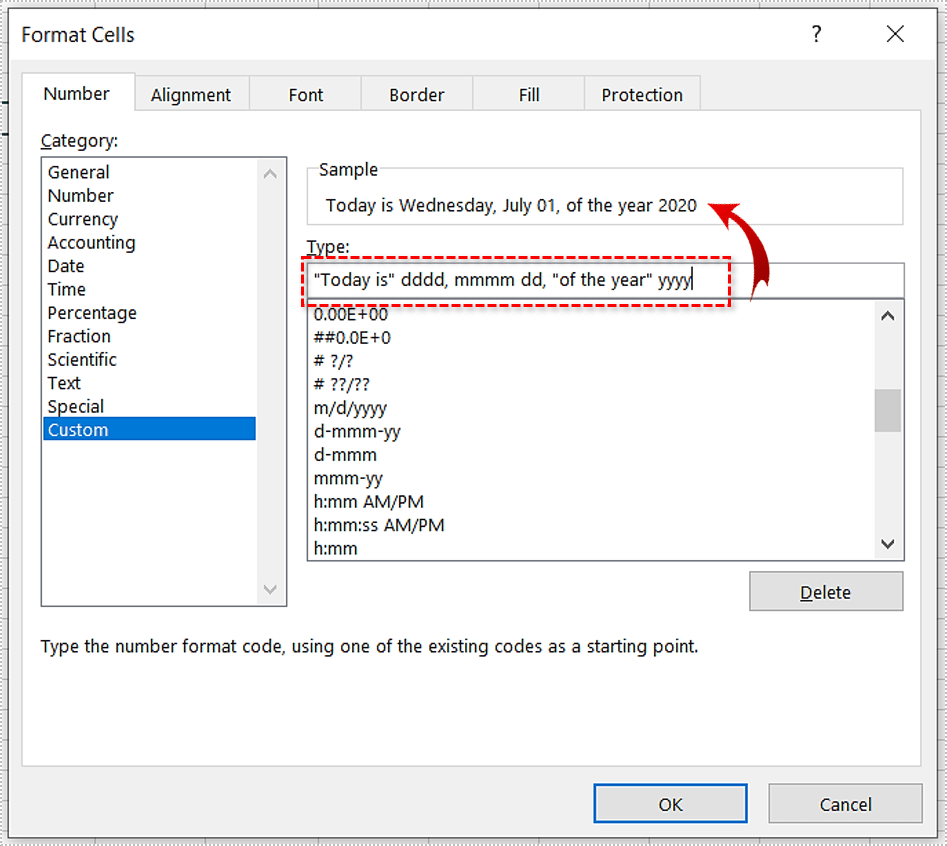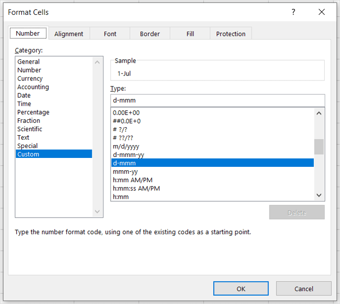 请注意,左侧选择的类别是“自定义”。那是因为它是 Excel 使用的默认格式。您可以在此处选择一种建议的格式,也可以定义自己的格式。在“类型:”字段中,就在建议格式列表的正上方,您可以准确输入日期的显示方式。