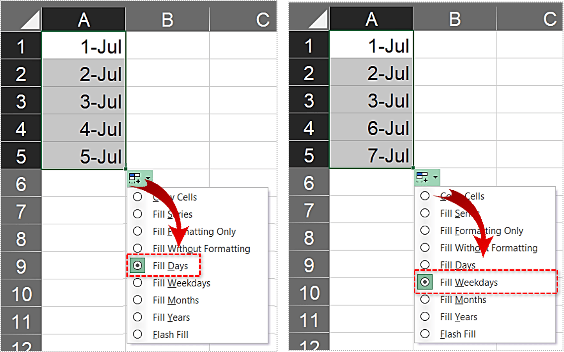 为此,重复前面的过程,除了现在使用鼠标右键拖动填充手柄。当你松开它时,会弹出一个菜单。您可以在此处选择用天、工作日、月或年填充所选单元格。