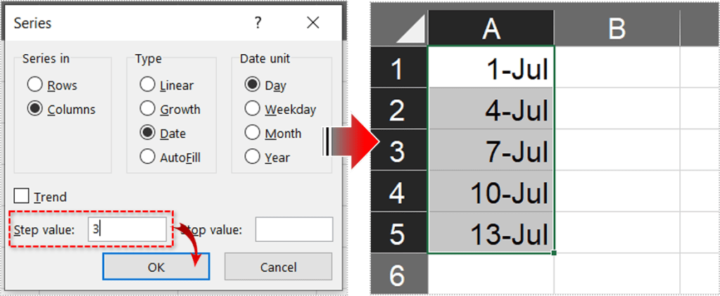 如果您需要更多自动日期选项,请选择“系列...”而不是之前的选项之一。拖动填充手柄后,单击“主页”选项卡。在“编辑”部分选择“填充”,在下拉菜单中选择“系列”。例如,如果您计划的活动应每三天重复一次,请将“日期单位”设置为“天”,将“步长值”设置为 3。