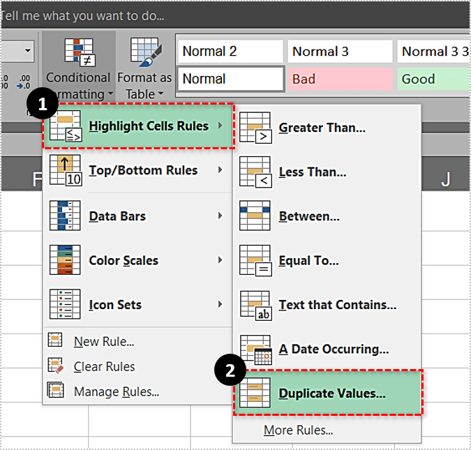 - 在条件格式下,转到突出显示单元格规则,然后转到重复值。