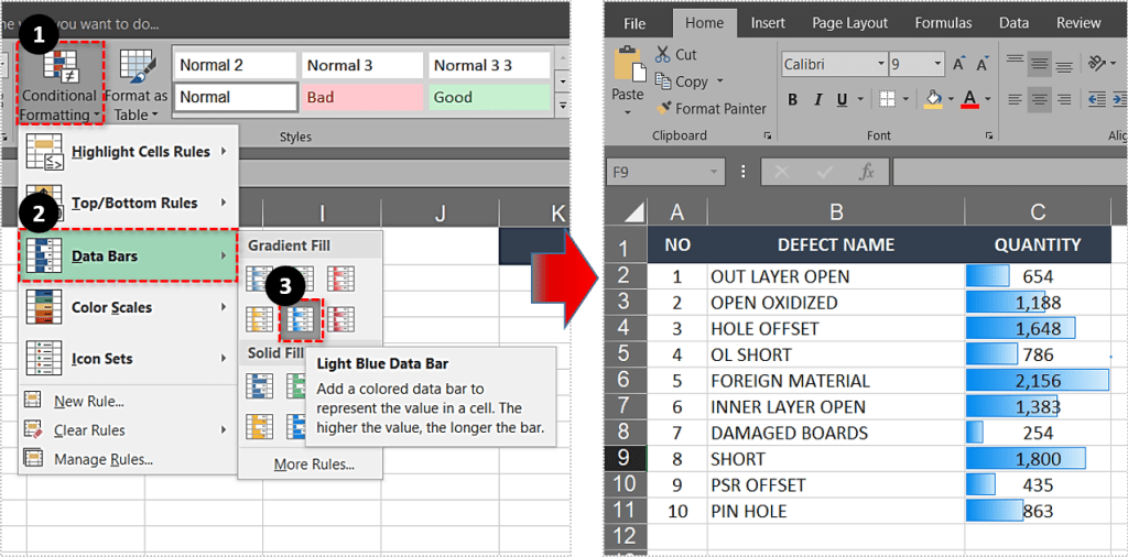数据条本质上在每个单元格中绘制一个条形,其长度对应于其他单元格的单元格值。这里有一张图来解释一下。