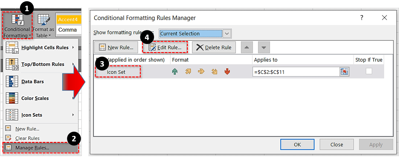 - 选择图标集规则并点击编辑规则。