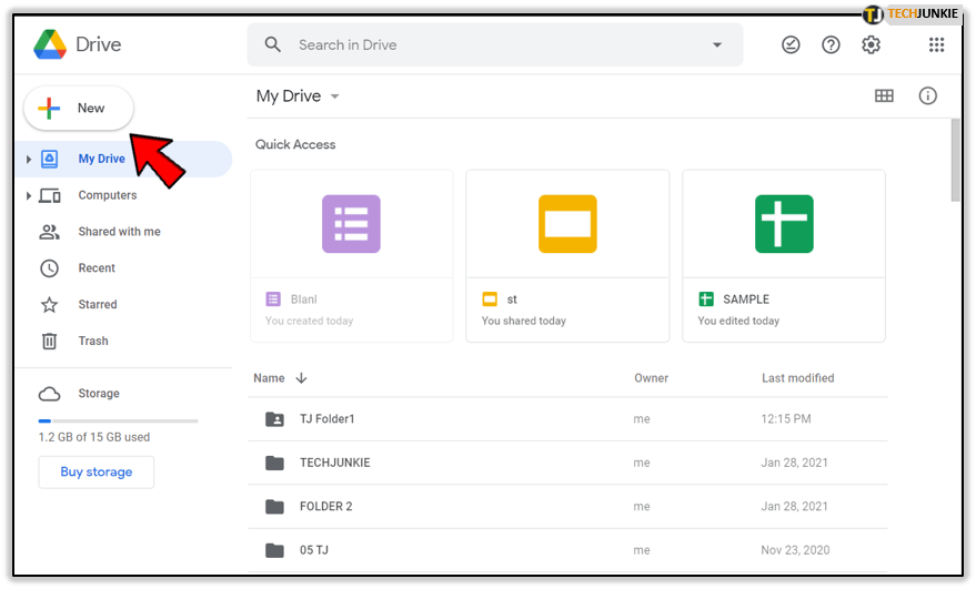 - 从 Google Drive 屏幕(您应该已经登录),打开一个新表单。为此,请单击屏幕左上角的 New 按钮。