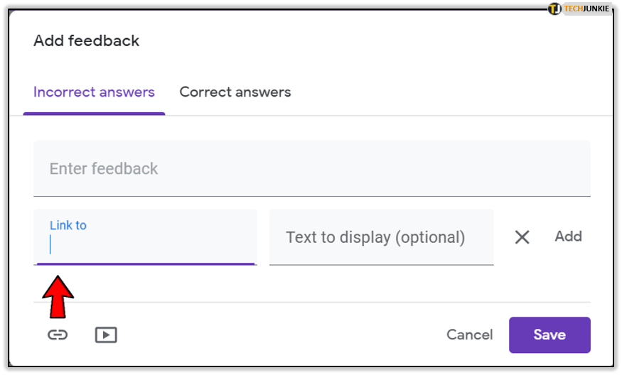 - 如果您在纠正学生时需要更直观的内容,您可以选择单击“链接”图标。这将允许您添加指向“添加反馈”选项的链接,以防您需要唤起学生的记忆,将他们引导至包含有关问题或主题的更多信息的页面或视频。