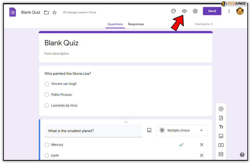 - 要测试自我评分或只是看看测验是如何形成的,您可以点击预览。它将是齿轮左侧的眼睛图标或设置图标。