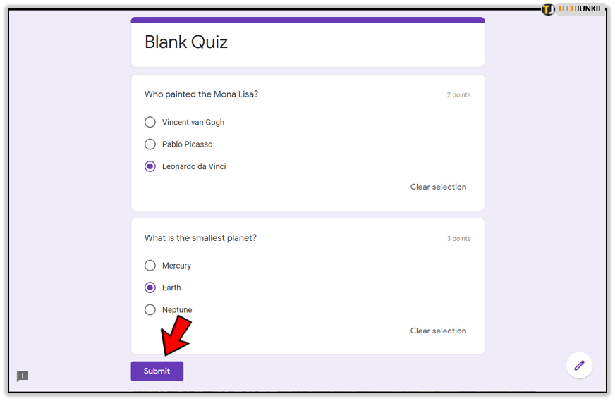 - 点击 Preview 在窗口的右上角,然后为每一个选择正确的答案测验中的问题之一。总而言之,假装是学生。回答完每个问题后,点击提交。