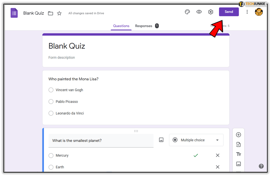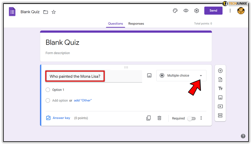 - 点击发送,位于“空白测验”(或您重命名的任何内容)屏幕的右上角。您现在应该盯着“发送表单”。