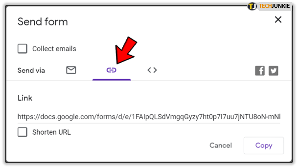 - “发送表单”将提供一系列不同的发送或附加表单的方式。您可以选择通过电子邮件、链接、嵌入或什至 Facebook 和 Twitter 等社交媒体将其发送出去。如果测验是团队的工作,还可以选择添加协作者。