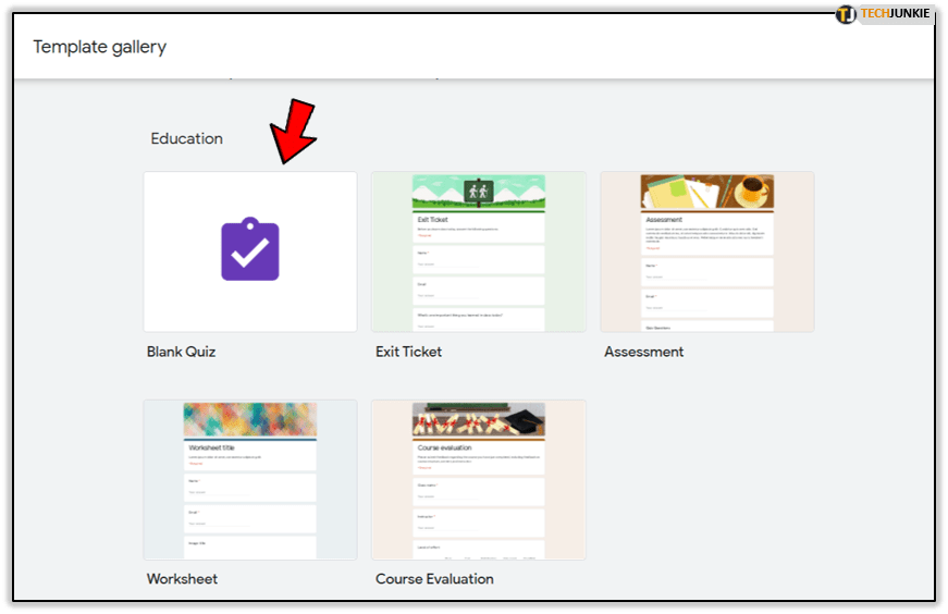 - 如果您想快速使用测验模板(首选),请在点击 Google 表单,单击右侧的 >。这将提供两个选项:blank form 或 来自模板。从模板中选择并向下滚动到“教育”部分并选择空白测验.