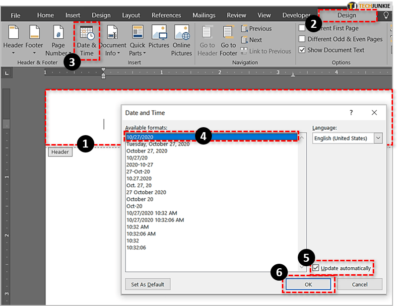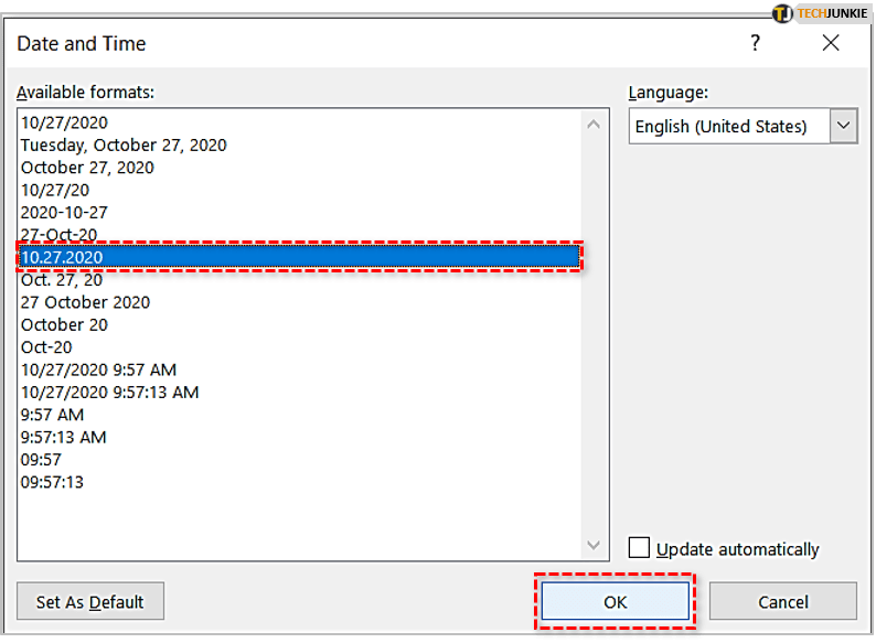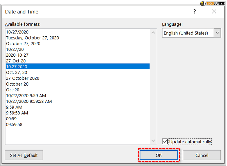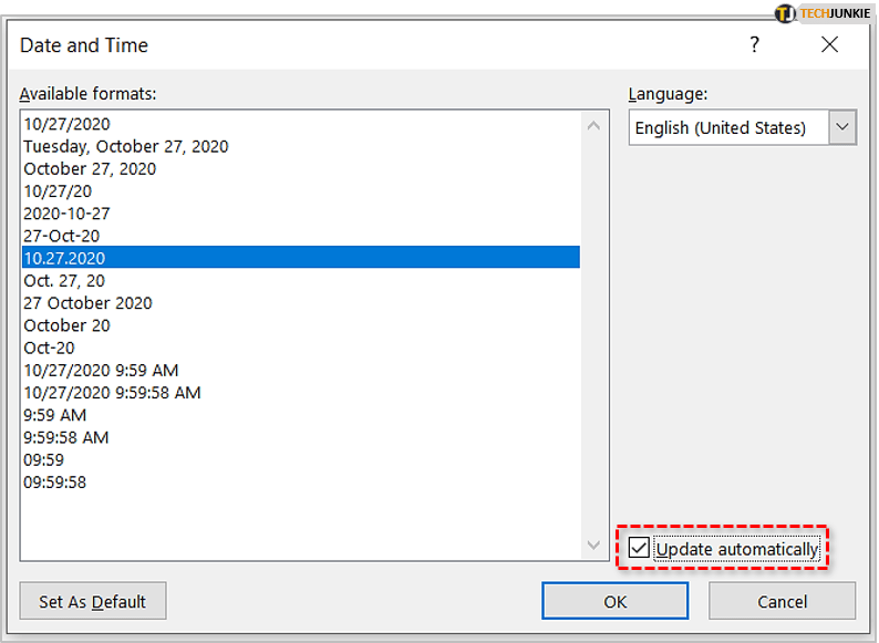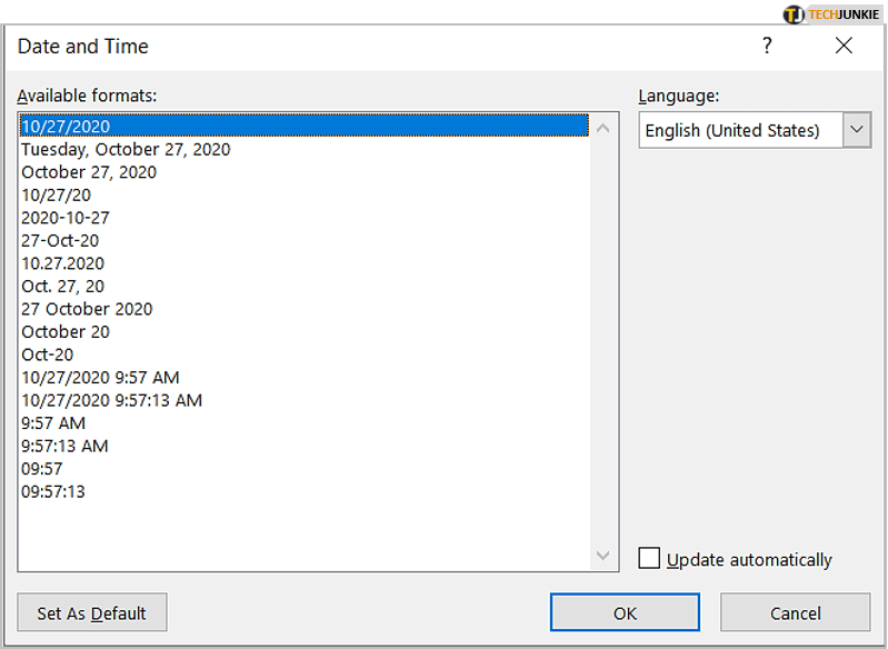 - 当“日期和时间”对话框出现时,您将能够选择一种格式,如果需要,请选中“自动更新”框,然后单击“确定”保存并关闭。