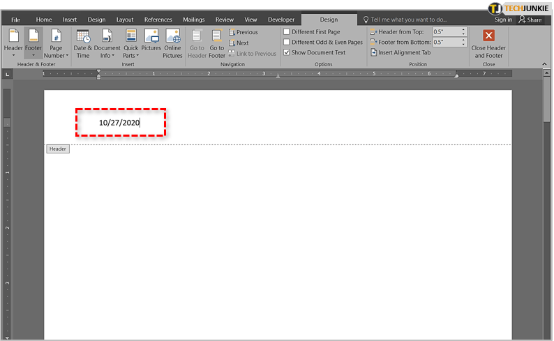 - 双击页眉或页脚.这将打开 Header &页脚工具。
