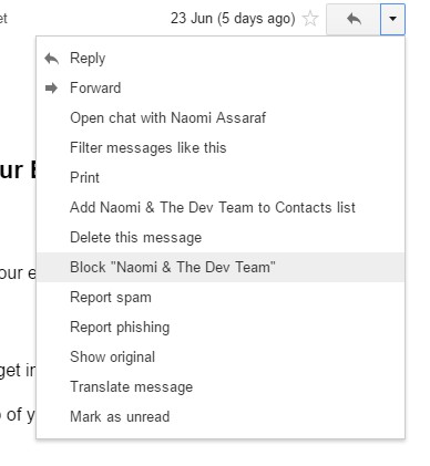将扩展程序添加到 Chrome 后,打开来自您需要阻止的发件人的 Gmail 电子邮件。现在您会在电子邮件上方找到一个阻止按钮,如下面的快照所示。单击按钮的箭头可展开带有额外选项的菜单。