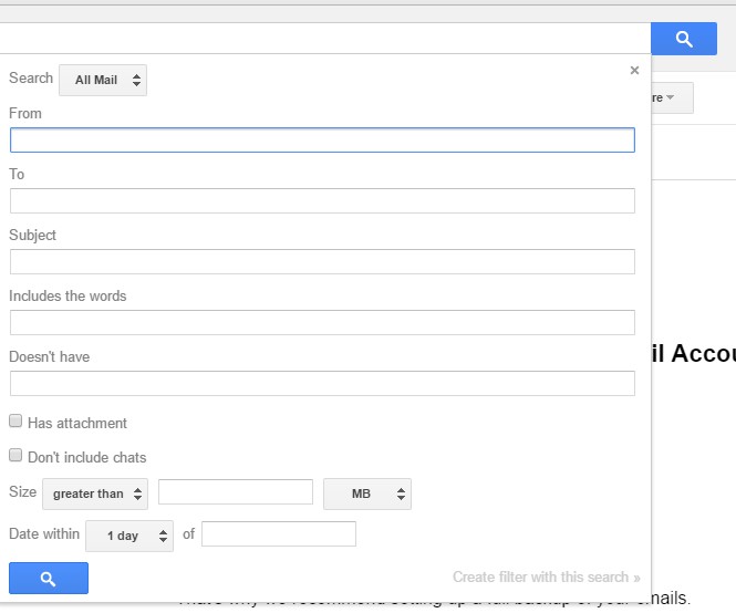 您可以将 Gmail 配置为使用过滤器自动删除来自指定电子邮件地址的电子邮件。要设置过滤器,请点击 Gmail 搜索框右侧的箭头按钮。这将打开下方镜头中显示的过滤器框。