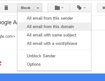 选择来自此发件人的所有电子邮件以阻止发件人的电子邮件地址。或者您可以选择来自该域的所有电子邮件来阻止从网站发送的邮件。如果您没有从菜单中选择一个选项,该按钮的默认操作是阻止来自特定发件人的电子邮件。选择取消阻止发件人选项以取消阻止被阻止的电子邮件地址。
