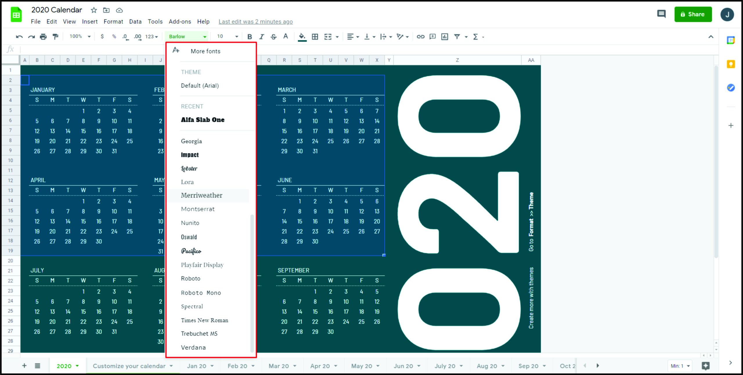 Google 表格工具包中的一项新功能是主题。对于在自定义环境中创建电子表格的用户很有用。对于每个主题,您都可以选择默认字体、颜色、背景等。每当您开始制作新文档时,您都可以打开主题,您的所有调整都会在那里。