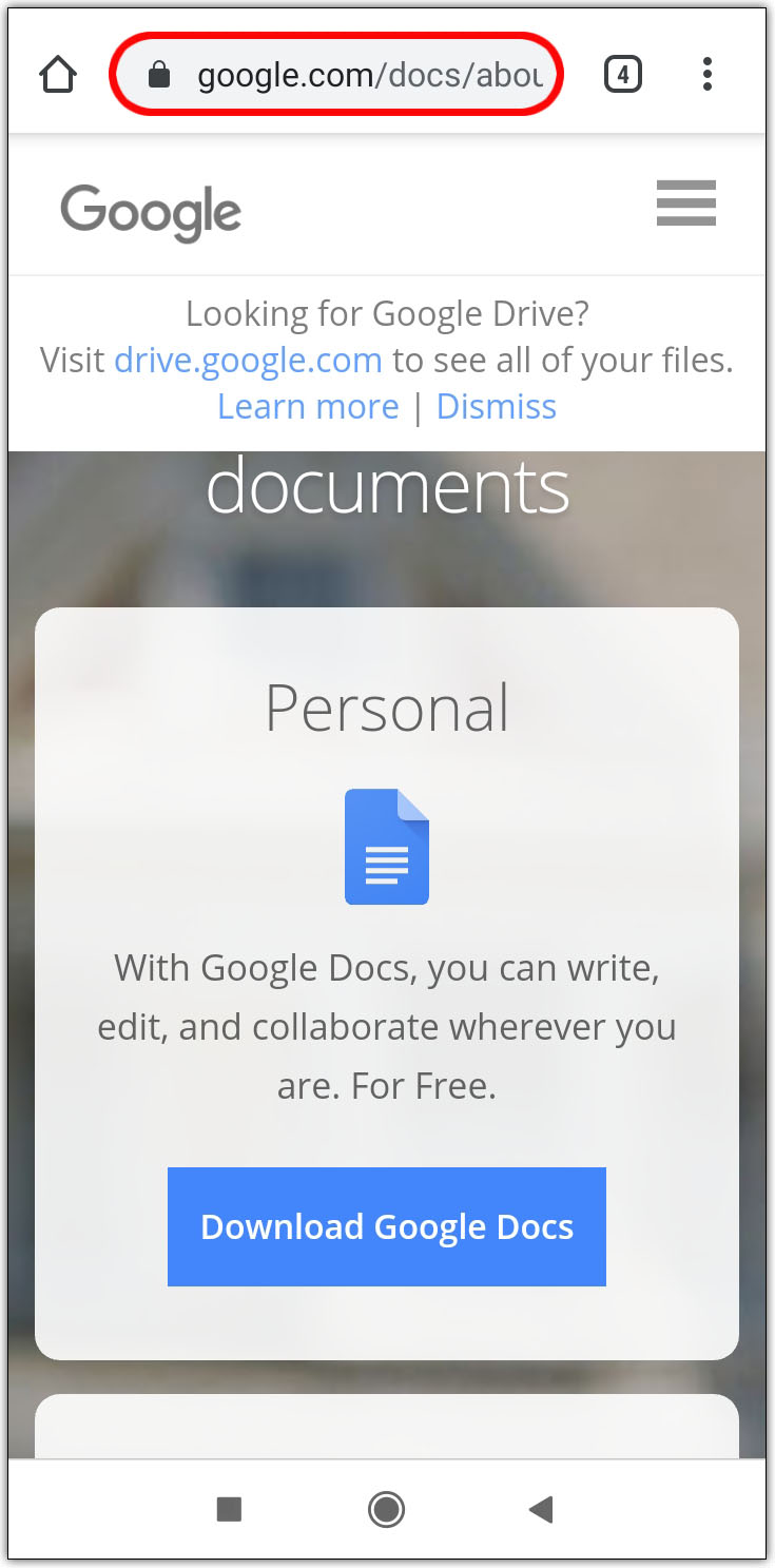 - 打开网络浏览器并输入 https ://docs.google.com/进入地址栏,然后点击“开始”。