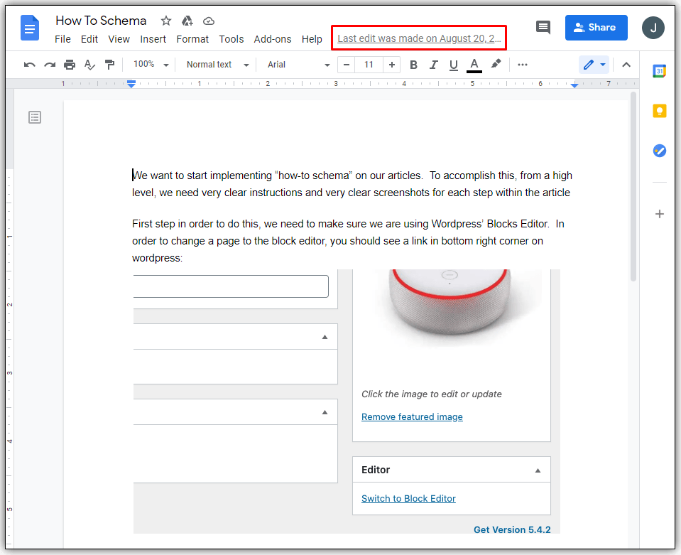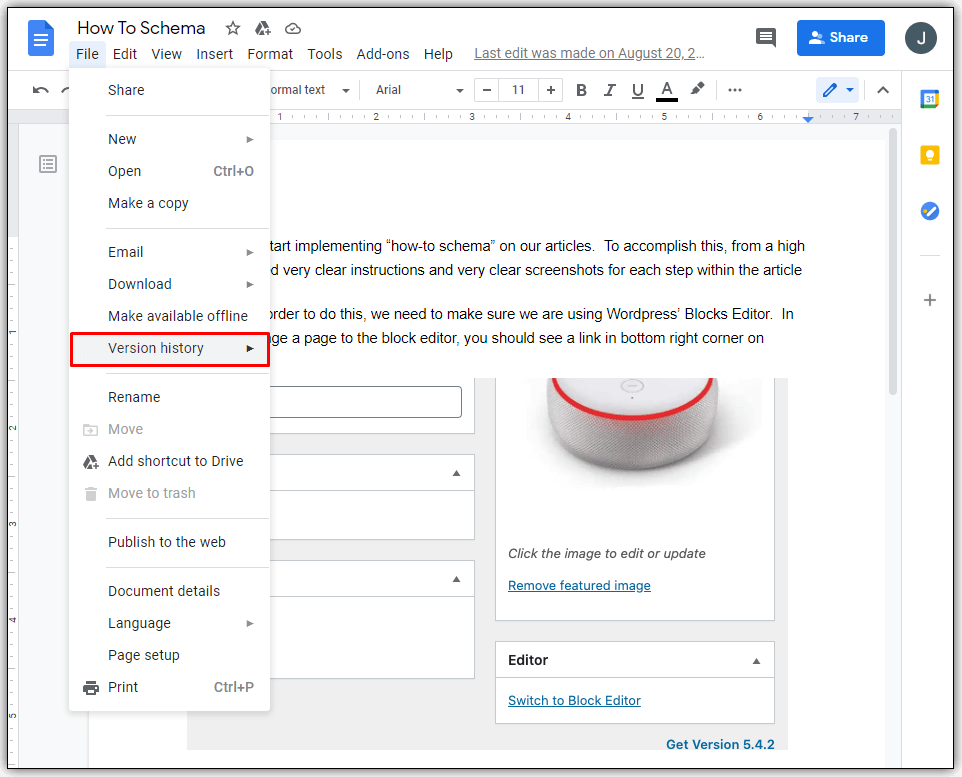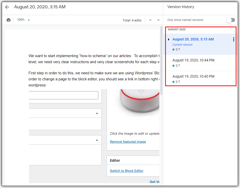- 点击“查看版本历史”。将启动一个新页面,您可以在其中查看对文档的所有编辑。同样,编辑历史将在右侧,文档的当前版本显示在左侧。