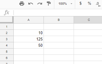 Google 表格用户可以通过直接在功能栏中输入除法 (/) 和乘法 (*) 将英尺转换为米。例如,打开一个空白的 Google 表格电子表格。然后在单元格 A2:A4 中输入“10”、“125”和“50”,如下面的快照所示。