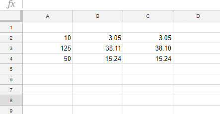 现在从 B 列的值中删除一些小数位。您可以通过选择一个单元格并按下表格工具栏上的减少小数位按钮来删除小数位。或者,按增加小数位按钮为所选数字添加更多小数。当所有 B 列和 C 列编号都有两位小数时,您的电子表格将与下图中的相匹配。