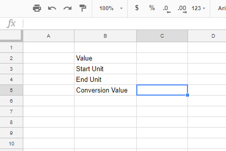 您可以使用 CONVERT 设置您自己的转换计算器。为此,请单击文件>在表格中新建以打开一个空白电子表格。在单元格 B2:B5 中输入“值”、“开始单位”、“结束单位”和“转化价值”,如下面的快照所示。