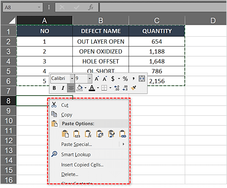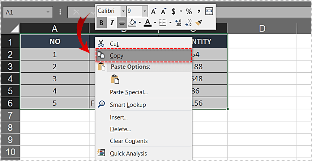 - 按 Ctrl + C 复制表格。或者,您可以右键单击并选择“复制”。如果要转置数据,请勿使用“剪切”选项或 Ctrl + X。