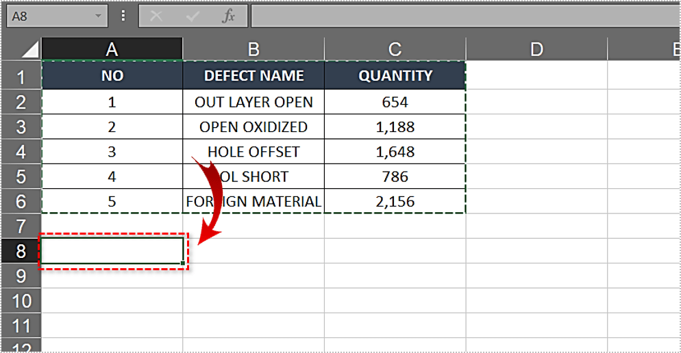 - 在 Excel 工作表上选择要粘贴转置表的空白位置。您还可以打开一个新的 Excel 工作表并将表格粘贴到那里。请记住,如果您将新数据粘贴到现有数据上,旧数据将直接消失。
