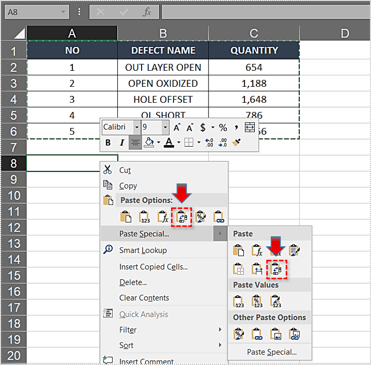 如果您在粘贴选项中没有看到“转置”选项,可能是因为您想要粘贴 Excel 表格而不仅仅是数据范围。由于该功能不适用于 Excel 表格,您需要将其转换为数据范围。