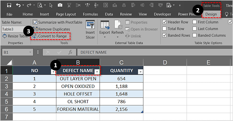 注意表格的特征会消失您将其转换为数据范围。例如,您将无法对行标题进行排序和过滤,因为箭头将消失。
