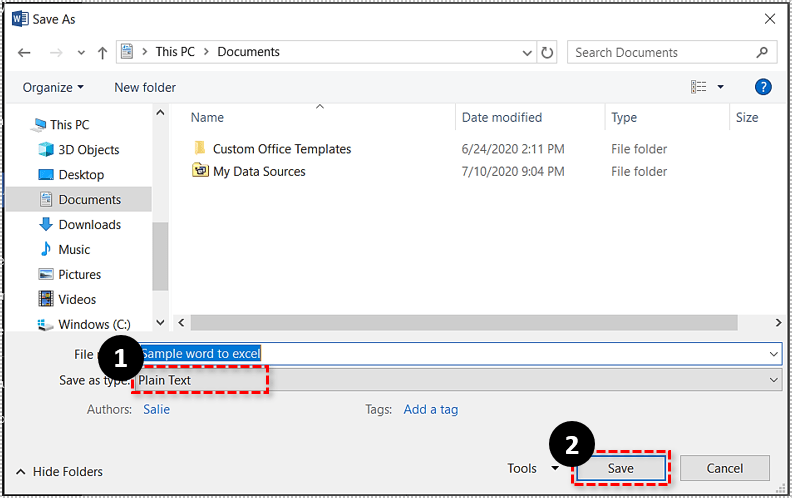 首先,在 MS Word 中打开要转换为 Excel 电子表格的文档。单击“文件”选项卡并选择另存为以在下面的快照中打开窗口。从另存为类型下拉菜单中选择纯文本选项。选择一个文件夹来保存文件。
