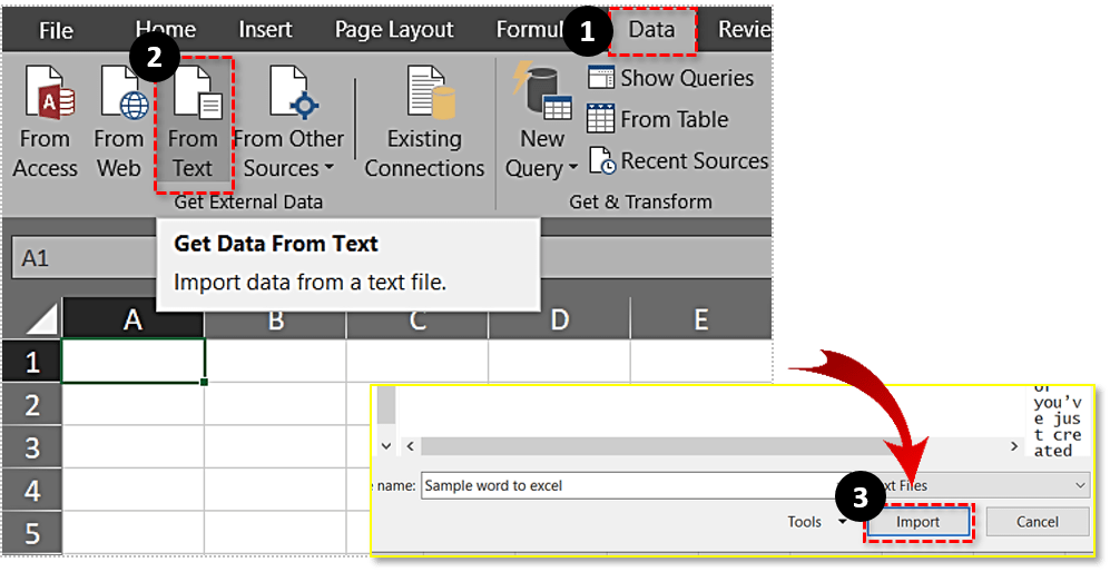 在 MS Excel 中打开一个空白电子表格。单击“数据”选项卡,然后按从文本按钮打开“导入文本文件”窗口。选择您在 Word 中保存的纯文本文件,然后按导入按钮。
