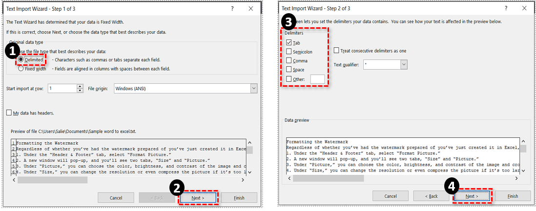 将打开文本导入向导,包括导入文档的三个步骤。首先,选择Delimited 数据类型选项。按下一步按钮打开更多分隔符选项。