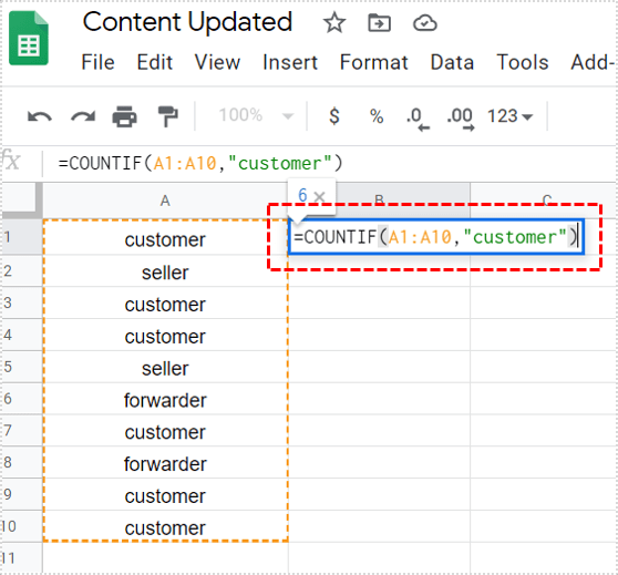 - 输入以下公式: =COUNT IF (A1:A10, “customer”).