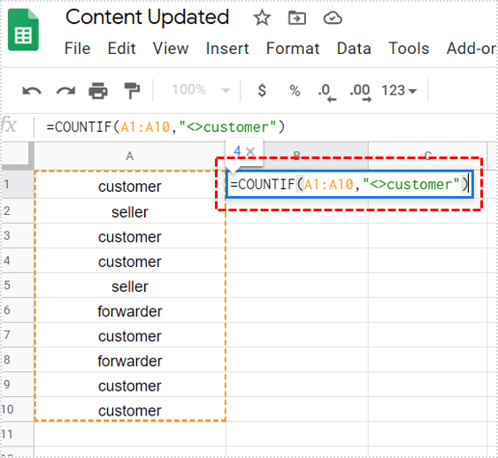 我们现在将向您展示一个修改后的 Count If 公式。假设您想知道有多少单元格不包含“客户”一词。这是你必须做的: