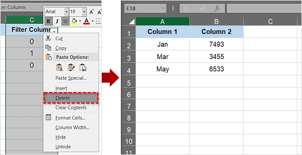 现在您可以删除过滤列。右键单击 C 列并选择删除选项。这将从表格中删除 C 列。