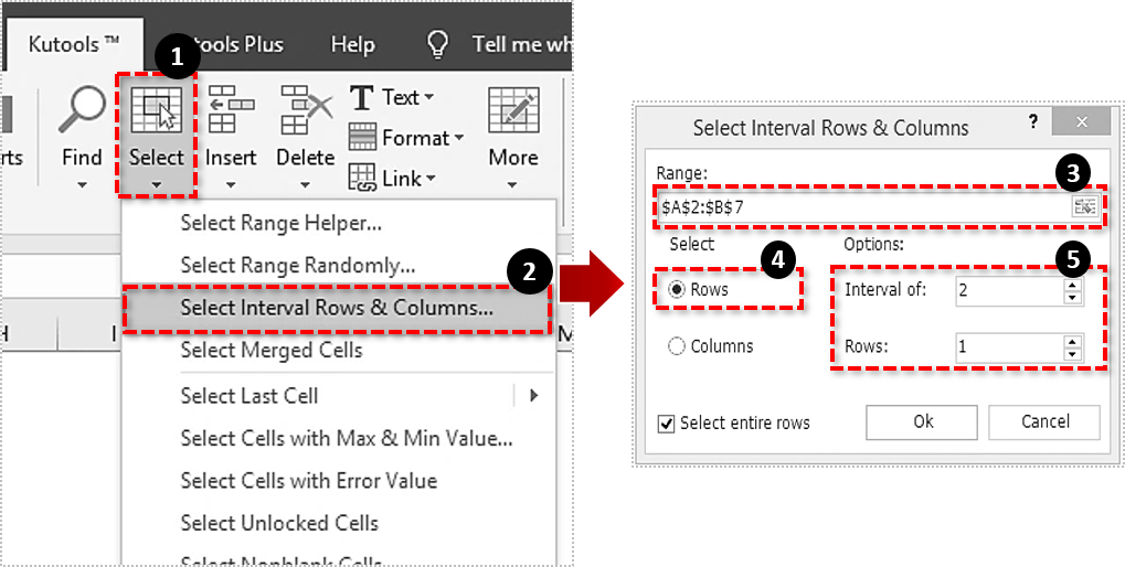 如果您将 Kutools For Excel 添加到应用程序中,您可以通过按下 Kutools 选项卡上的选择按钮来打开该工具。单击 选择间隔行和;按钮菜单上的列...。这将打开一个 Select Interval Rows &列窗口,您可以在其中通过调整 Interval of 和 Row 值来配置行选择。那里之后,您可以删除突出显示的行选择。