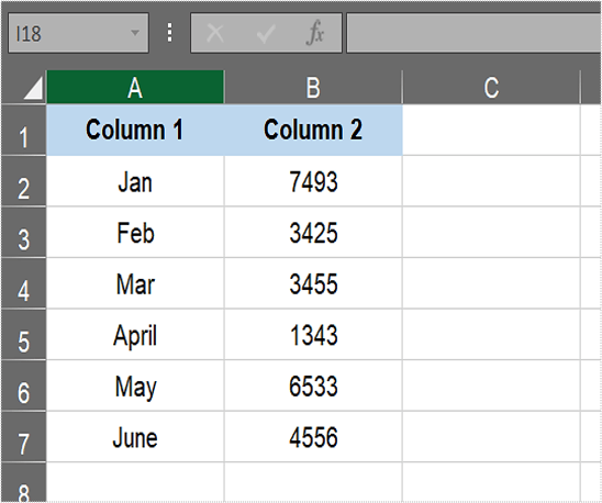例如,让我们在空白 Excel 电子表格中设置表格。在单元格 A1 和 B1 中输入“第 1 列”和“第 2 列”。接下来,在A2中输入'Jan',在A3中输入'Feb',在A4中输入'Mar',在A5中输入'April',在A6中输入'May',在A7单元格中输入'June'。向区域 B2:B7 中的每个单元格添加一些随机数。您的表格将有两列由六行(不包括标题)组成,如下面的屏幕截图所示。
